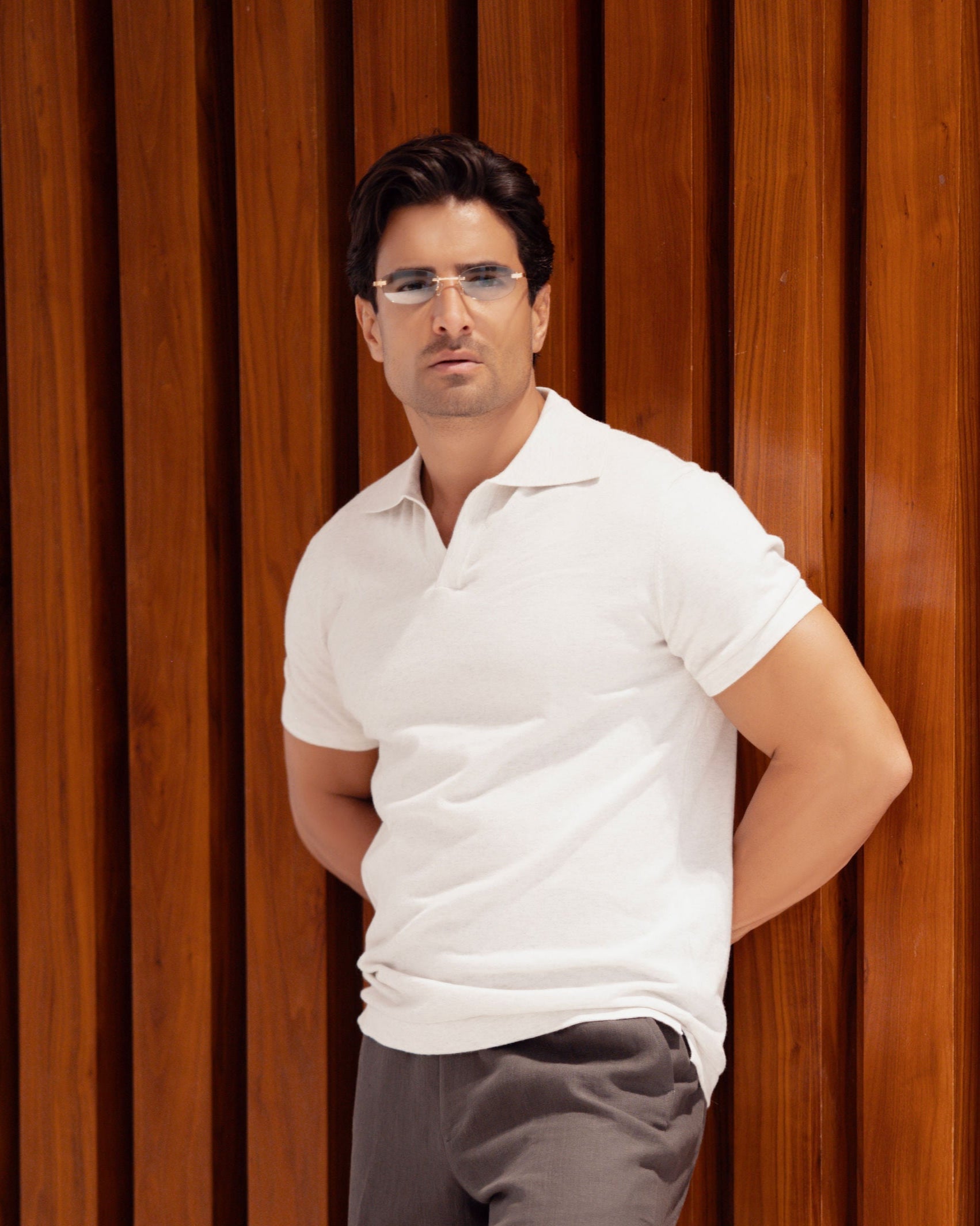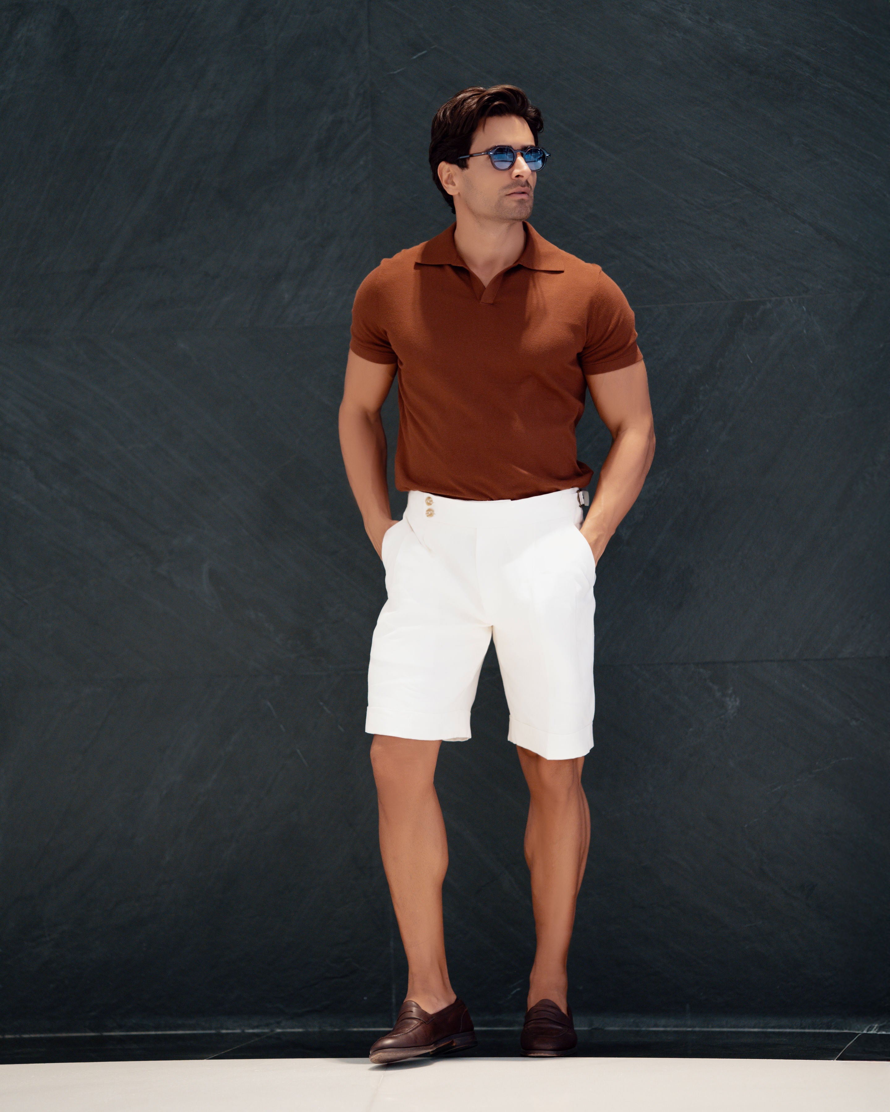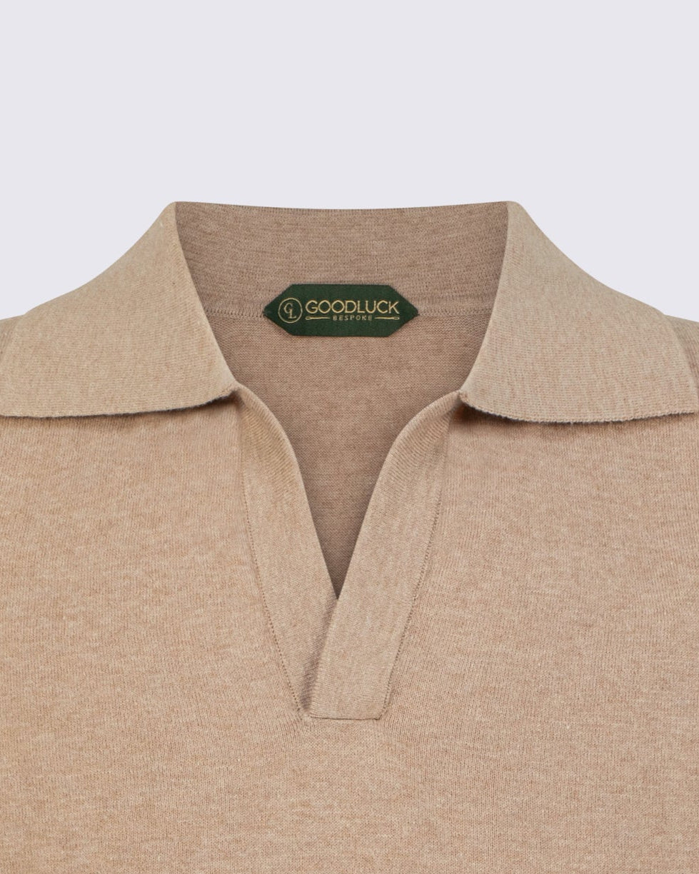 A refined staple for the modern wardrobe, the Open Collar Polo combines 95% premium cotton with 5% cashmere for an exceptionally soft and breathable feel. The open neckline creates a relaxed yet tailored silhouette, making it equally at home under a blazer or paired with linen trousers. Designed for all-day ease, it’s the quiet expression of leisure and elegance.